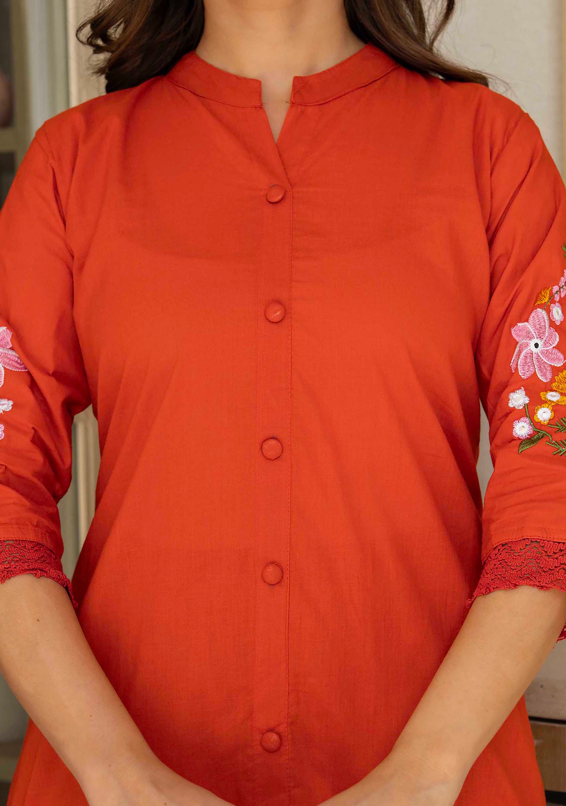 Key Details: Showcases stunning, multicolored floral embroidery densely covering the back yoke and both 3/4th sleeves. The kurta hem and sleeve cuffs are elegantly finished with delicate, matching orange lace trim.